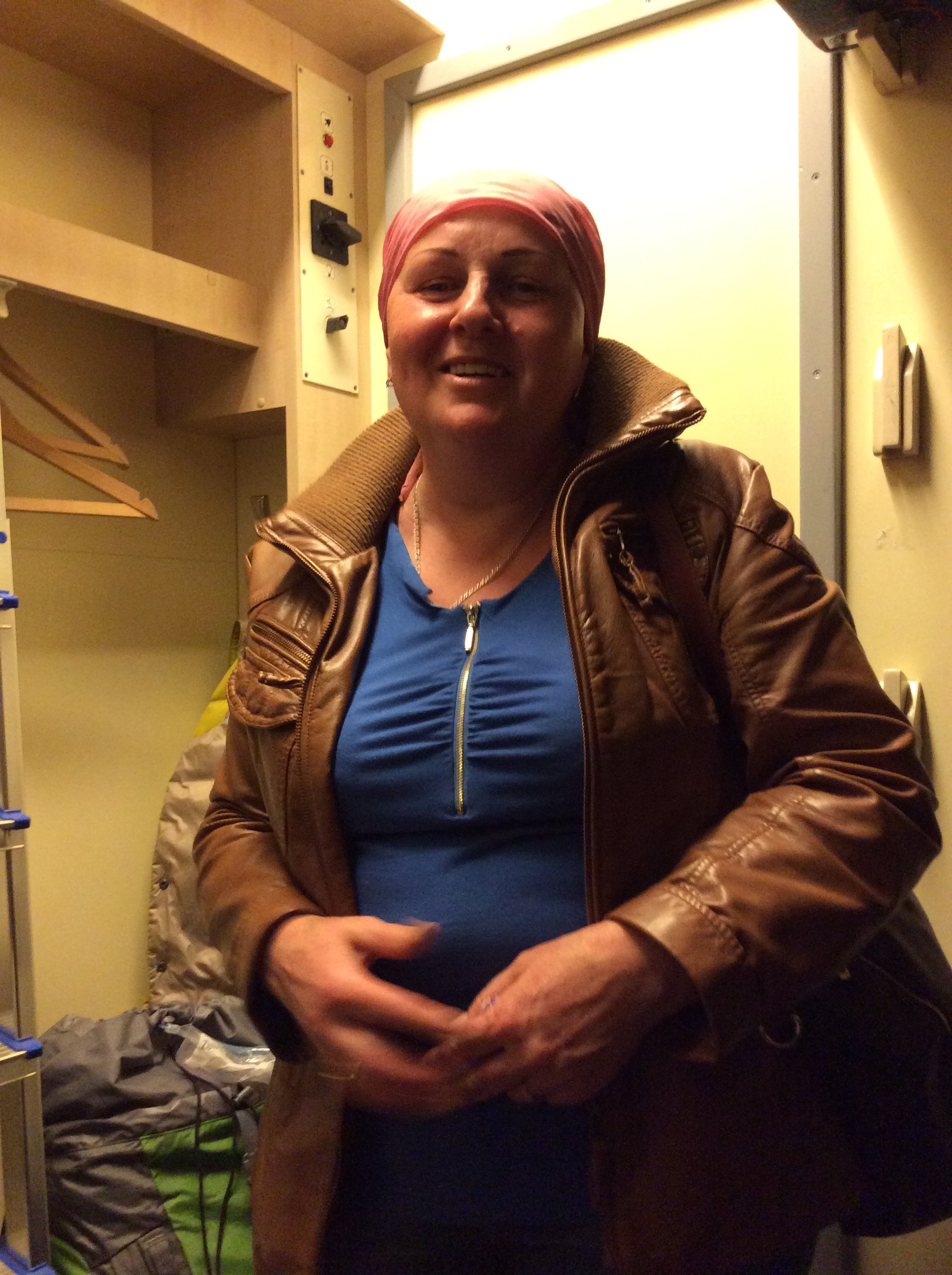She is 49 and wanted to sell me more food. I could possibly buy any more as I already gave some away. We are standing still and some train works are going on. Not sure what they are doing but it looks like they are servicing the train ??