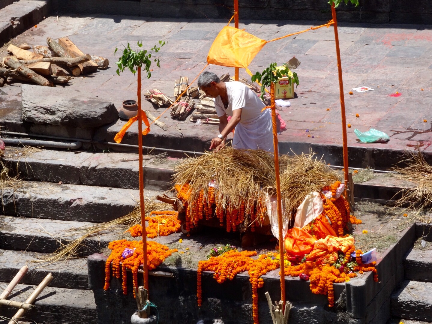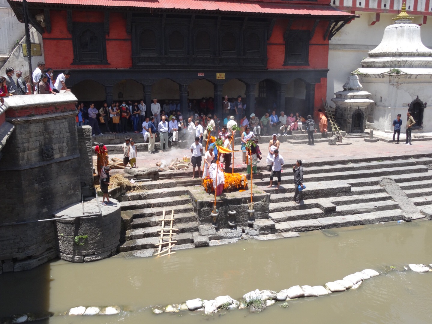 The atmosphere is peaceful and calm. People watch the ceremonies and some had something like a little pick nick. I could see a cow chilling at the river and men collecting left over burned wood out of the river which wasn’t very easy to get out.